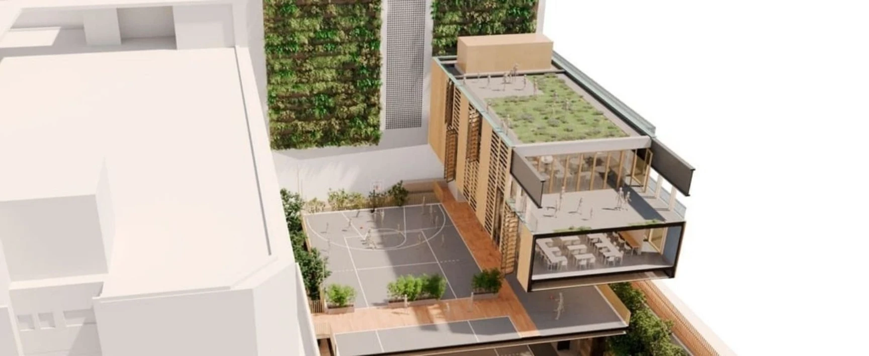 El proyecto no solo renueva el espacio existente, sino que lo multiplica mediante una estrategia innovadora: la creación de un área polideportiva subterránea y un edificio puente elevado.